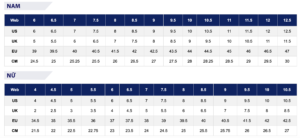 BẢNG SIZE GIÀY ASICS